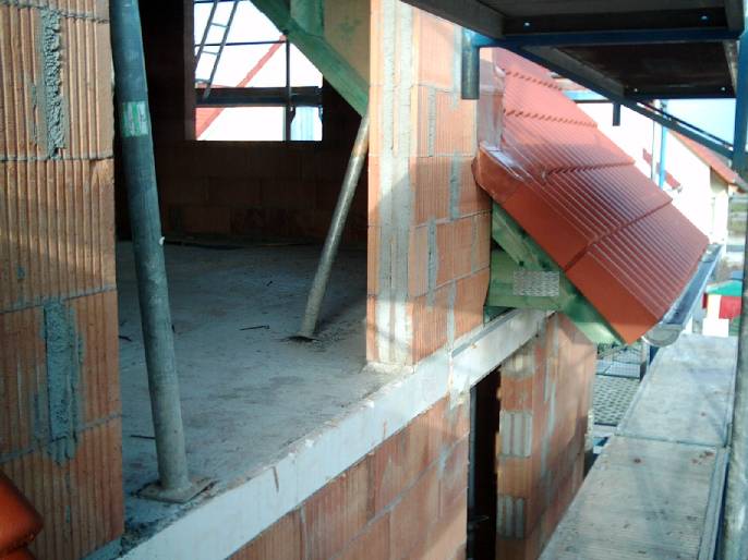 21. September 2005: Das künftige Gaubenfenster dient momentan als Zugang zum OG! Außerdem sieht man die Ziegel des Daches und die Dachrinne! | ||