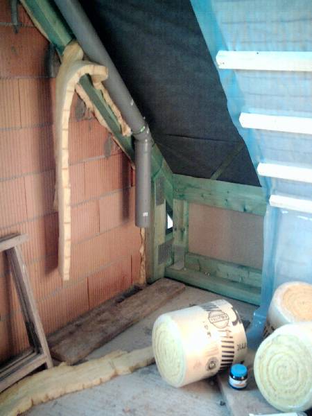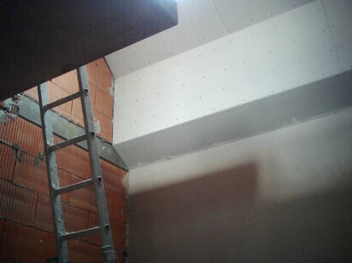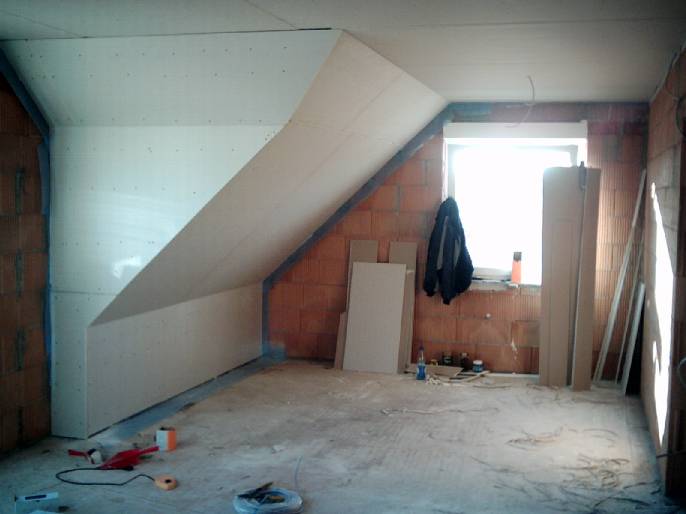 Dachschräge Trockenbauplatten und rechts die verputzte Wand zu