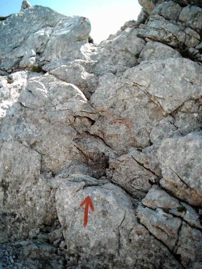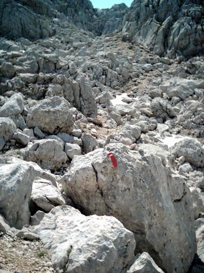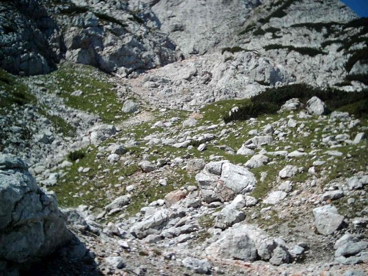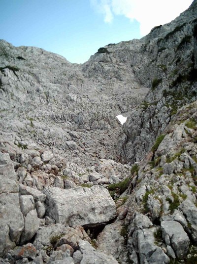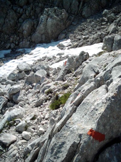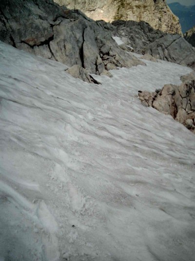 Die Schneefelder sind an der Oberfläche recht weich, so daß man eine Spur ziehen kann, um nicht abzurutschen!